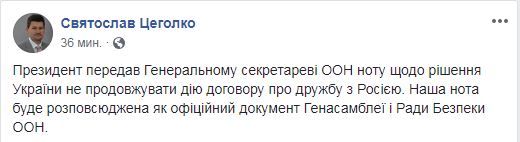 "Президент передал Генеральному секретарю ООН ноту о решении Украины не продлевать действие договора о дружбе с Россией. Наша нота будет распространена в качестве официального документа Генассамблеи и Совета Безопасности ООН", - написал Цеголко.