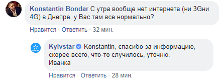 "С утра вообще нет интернета (ни 3Gни 4G) в Днепре, у Вас там все нормально?"