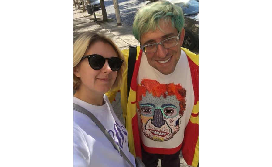 Гарик Корогодский был одет в ярко-желтую ветровку и красочную футболку. Также у него волосы окрашены в необычный цвет.