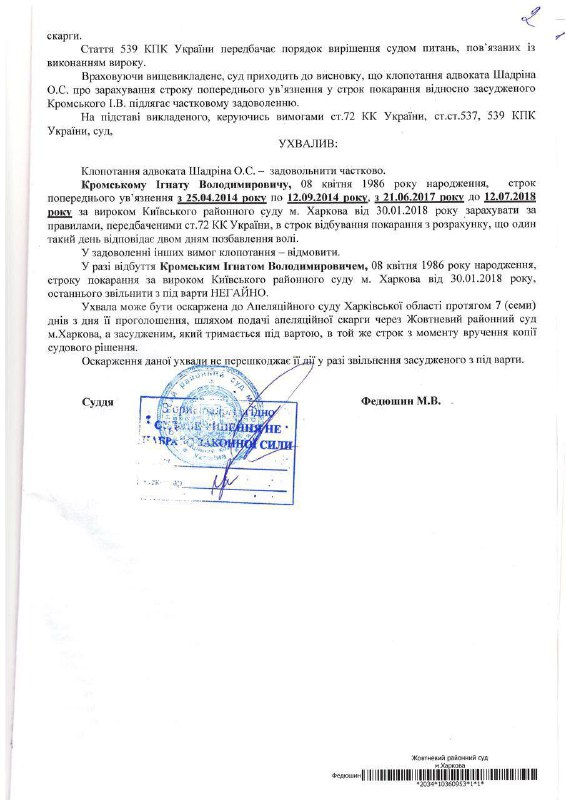 Как рассказал "Стране" Александр Шадрин, несмотря на июльские прогнозы прокуратуры Харьковской области о дальнейшем двухлетнем пребывании под стражей активиста Игната Кромского, сегодня удалось добиться его освобождения благодаря позиции Большой Палаты Верховного Суда о действии "закона Савченко" во времени.