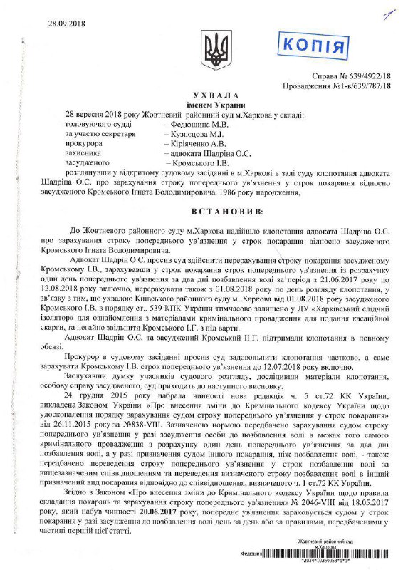 "Как разъяснил Верховный Суд: имеет значение время совершения деяния, - если деяние совершено до 21 июня 2017 года (дата отмены "Закона Савченко"), то к такому лицу применяется данный закон с момента задержания до вступления приговора в законную силу. Таким образом, удалось добиться освобождения Игната Кромского, фактически содержащегося под стражей более 4 лет (включая 95 дней без решения суда в не зарегистрированном СИЗО СБУ в Харькове)", - сказал Шадрин.