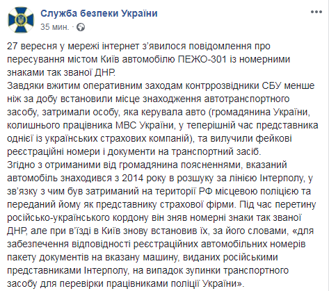 "Согласно полученным от гражданина объяснениям, указанный автомобиль находился с 2014 года в розыске по линии Интерпола, в связи с чем был задержан на территории РФ местной полицией и передан ему как представителю страховой компании. При пересечении российско-украинской границы он снял номерные знаки так называемой "ДНР", но при въезде в Киев снова установил их, по его словам, "для обеспечения соответствия регистрационных автомобильных номеров пакета документов на указанную машину, выданных российскими представителями Интерпола, в случае остановки транспортного средства для проверки работниками полиции Украины", - рассказали в СБУ.