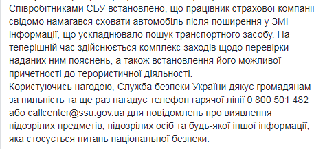 Установлено, что работник страховой компании сознательно пытался скрыть автомобиль после распространения в СМИ информации. СБУ сейчас проверяет предоставленные им объяснения, а также устанавливает возможную причастность мужчины к террористической деятельности. Фейковые номерные знаки и документы на автомобиль изъяты.