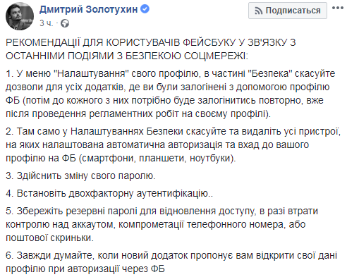 Замминистра информационной политики Дмитрий Золотухин дал рекомендации для пользователей Facebook в связи с хакерской атакой на учетные записи (аккаунты) в соцсети. Их он изложил на своей странице в Facebook.