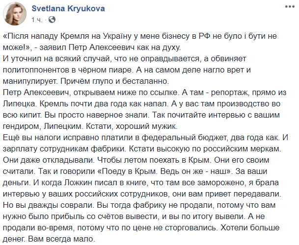 "Після нападу Кремля на Україну у мене бізнесу в РФ не було і бути не може!», – заявил Петр Алексеевич как на духу.