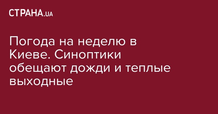 Сайт Weather.com сообщает, что в среду и четверг в Киеве стоит ждать проливной дождь. В понедельник-вторник +16...+18, затем температура опустится до +12...+14. На выходных сухо, до +16...+17.
