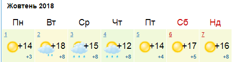 Сайт Укргидрометцентра обещает слабый дождь в среду и четверг. В начале недели днем +14...+16, со среды немного похолодает до +11...+15. Ночью +3...+8.