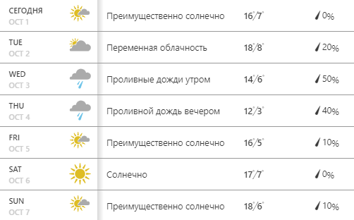 "Страна" собрала данные пяти ресурсов, чтобы составить прогноз погоды на неделю с 1 по 8 октября.