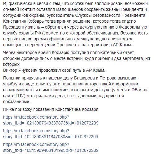 "Помощь в перелете в Крым Виктору Януковичу оказывала Федеральная служба охраны РФ, (аналог отечественной ГСО), а не широко известные граждане Баширов с Петровым, которые одним росчерком журналистского пера стали фигурировать и в нашем деле", - написал он.