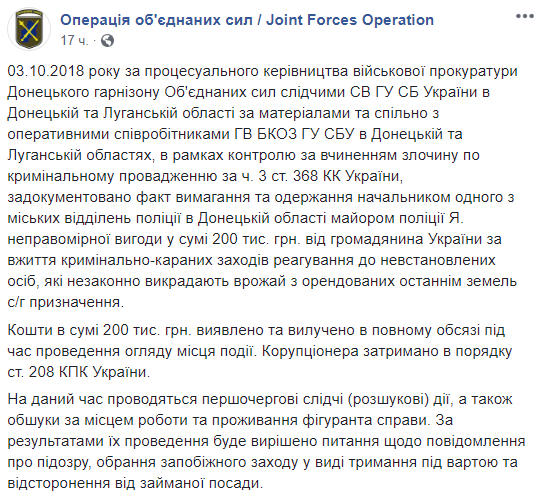 В частности, указано, что Янголенко требовал и получил 200 тысяч гривен взятки "от гражданина Украины за принятие уголовно наказуемых мер реагирования к неустановленным лицам, которые незаконно похищают урожай с арендованных последним земель с/х назначения".