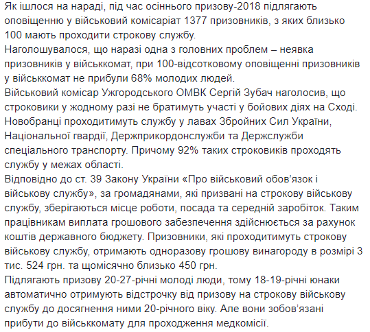 Так, на совещании военный комиссар Ужгородского ОМВК Сергей Зубач подчеркнул, что срочники не будут участвовать в боевых действиях на Донбассе. Новобранцы будут проходить службу в рядах ВСУ, Нацгвардии, Госпогранслужбы и Госслужбы специального транспорта. Причем 92% таких срочников проходят службу в пределах области.