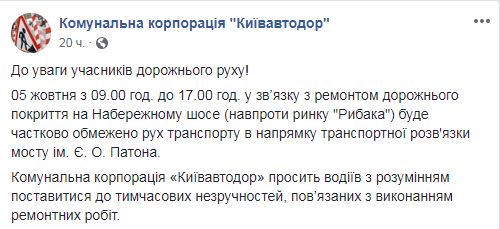 "5 октября с 09:00 до 17:00 в связи с ремонтом дорожного покрытия на Набережном шоссе (напротив рынка "Рыбака") будет частично ограничено движение транспорта в направлении транспортной развязки моста им. Патона", - говорится в сообщении.