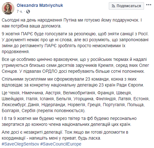 "В документе нет об этом ни слова, но все понимают, что предложенные изменения в регламент ПАСЕ сделают просто невозможными продолжение санкций. Все это особенно цинично, учитывая, что в российских тюрьмах продолжают удерживать около семи десятков заложников Кремля, среди которых Олег Сенцов. В подвалах ОРДЛО до сих пор находятся более сотни пленных", - подчеркнула Матвийчук.