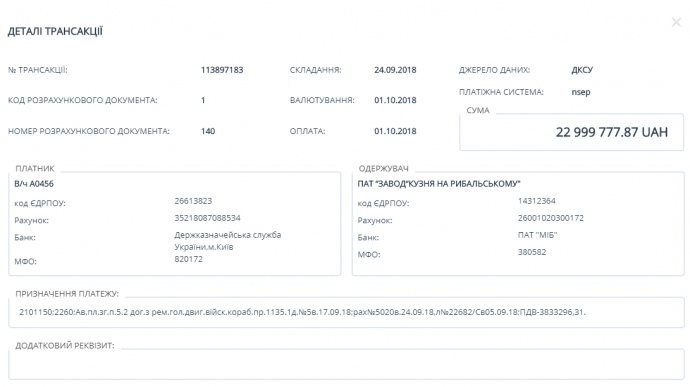 На портале говорится, что соглашение с "Кузней" подписано в сентябре 2018 года. Деньги перечислены военной частью А0456 военно-морских сил Украины.