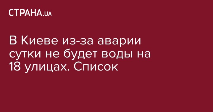 В Киеве сегодня, 8 октября, на 18 улицах отключили холодную воду из-за аварии в сети холодного водоснабжения. Об этом сообщает пресс-служба "Киевводоканала" на своей странице в Facebook.