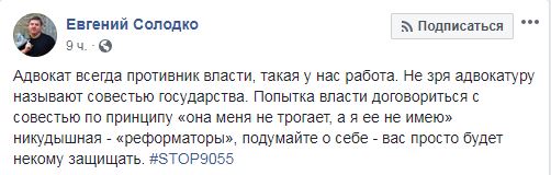 Защитник Евгений Солодко также призывает "реформаторов" подумать о себе - в свое время из просто некому будет защищать. "Адвокат всегда противник власти, такая у нас работа. Не зря адвокатуру называют совестью государства. Попытка власти договориться с совестью по принципу «она меня не трогает, а я ее не имею» никудышная - "реформаторы", подумайте о себе - вас просто будет некому защищать", - пишет Солодко в Facebook.