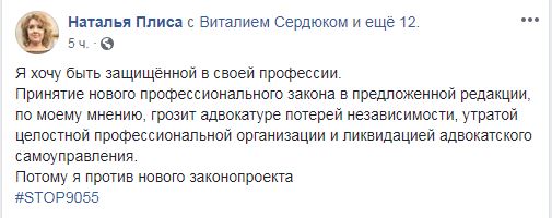 Адвокат Наталья Плиса в Facebook пишет, что хочет быть защищенной в своей профессии.