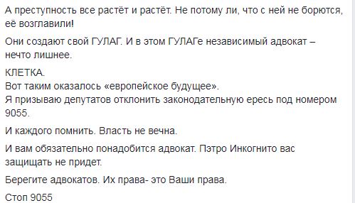 Известный адвокат Елена Лукаш считает, что законопроектом №9055 украинцев лишают доступа к правосудию, а адвокатов подчинить власти. "Судебная система развалена. Наша правоохранительная система добита, а ее ошметки занимаются политическими расправами и грабежами. Пришла очередь непокорных адвокатов. Но усмирить пытаются не только адвокатов, сузив ИХ права. Усмирить пытаются каждого из вас. Это вас лишат права на адвокатскую тайну, права на активную защиту, права на адвокатскую независимость", - пишет Лукаш.