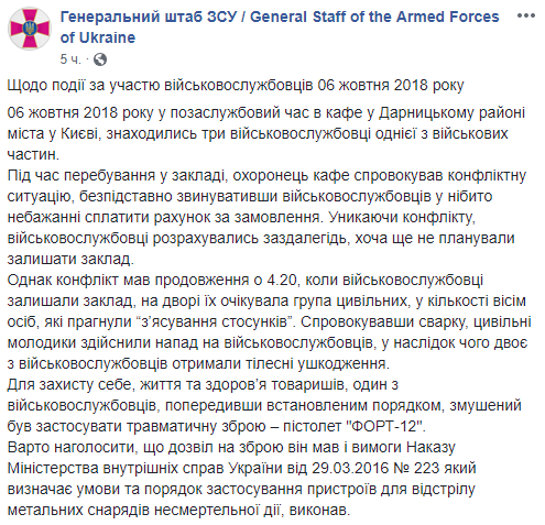 Согласно сообщению, военный использовал травматическое оружие во время конфликта в Дарницком районе столицы "для пресечения действий гражданских лиц, которые спровоцировали конфликт". Мужчина сделал это для защиты здоровья и жизни людей и с соблюдением правил его применения, говорится в сообщении Генштаба.