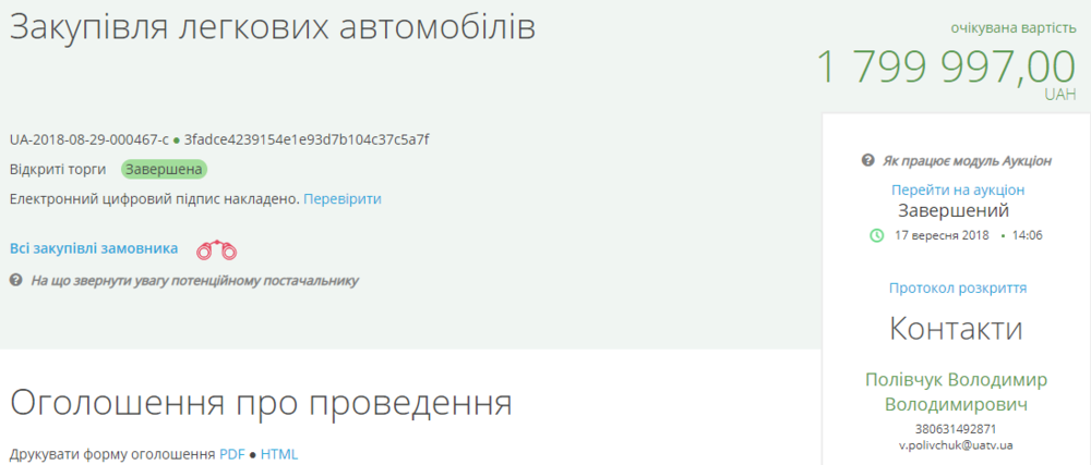 Согласно двум договорам, фирма поставит 10 автомобилей Skoda Octavia A7 Ambition 1,4 TSI 110 kW + пакет Techno по 599 тысяч гривен. В первом соглашении говорится о 7 авто за 4,19 млн грн., во втором - о 3 машинах за 1,79 млн грн.