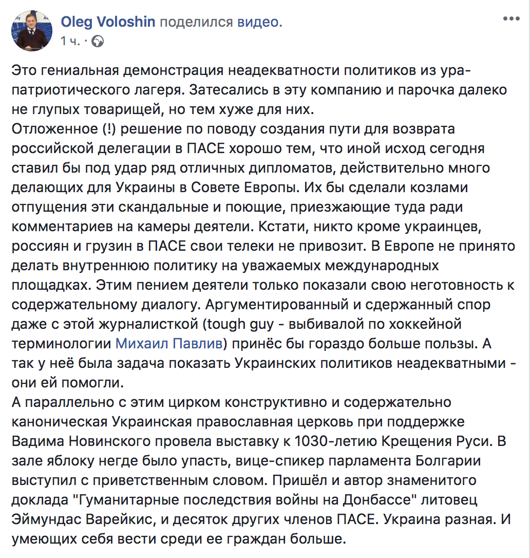 "Отложенное (!) решение по поводу создания пути для возврата российской делегации в ПАСЕ хорошо тем, что иной исход сегодня ставил бы под удар ряд отличных дипломатов, действительно много делающих для Украины в Совете Европы. Их бы сделали козлами отпущения эти скандальные и поющие, приезжающие туда ради комментариев на камеры деятели. Кстати, никто кроме украинцев, россиян и грузин в ПАСЕ свои телеки не привозит. В Европе не принято делать внутреннюю политику на уважаемых международных площадках. Этим пением деятели только показали свою неготовность к содержательному диалогу", - пишет Волошин.