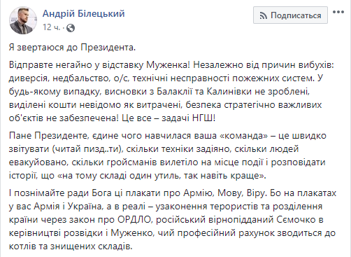 "Отправьте немедленно в отставку Муженко! Независимо от причин взрывов: диверсия, халатность, технические неисправности пожарных систем. В любом случае выводы из Балаклеи и Калиновки не сделаны, выделенные средства неизвестно как потрачены, безопасность стратегически важных объектов не обеспечена! Это все – задачи начальника Генштаба!" – написал он.