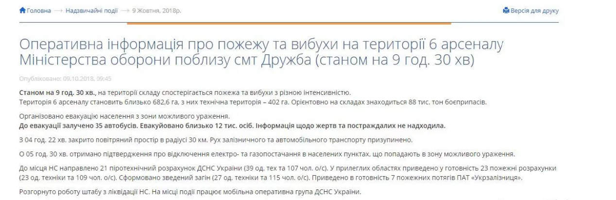 - 09:45 – ГосЧС на своем сайте публикует оперативную информацию о ситуации на 6-м арсенале по состоянию на 09:30. Среди прочего в ней спасательная служба говорит: "Ориентировочно на складах находится 88 тыс. тонн боеприпасов".