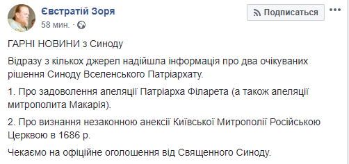 Ждем официального объявления от Священного Синода", - написал в соцсети Евстратий Зоря.