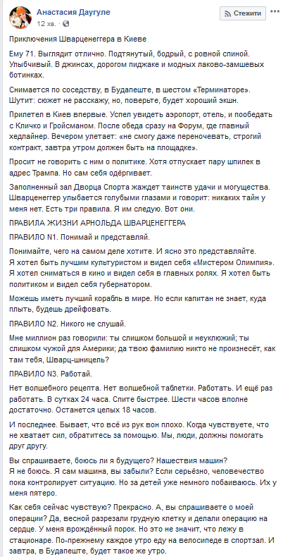 А вот телеведущую программы "Утро с "Интером" Анастасию Даугуле восхитил внешний вид и то, как стальной Арни держится на публике. "Ему 71. Выглядит отлично. Подтянутый, бодрый, с ровной спиной. Улыбчивый. В джинсах, дорогом пиджаке и модных лаково-замшевых ботинках", - написала у себя в Facebook телеведущая.