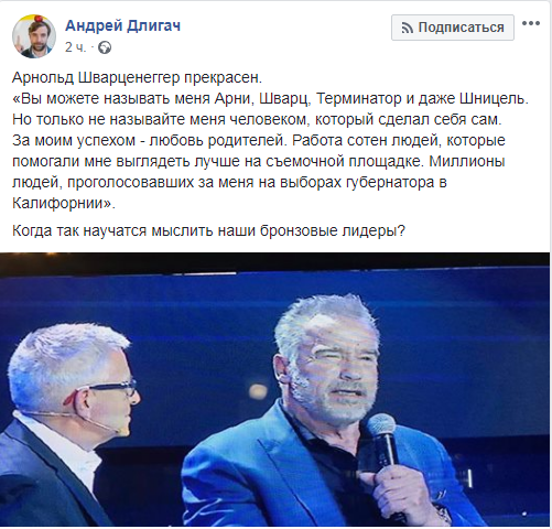 В своей речи, в частности, он сказал, что не стоит называть его человеком, который сделал себя сам, потому что за его успехом стоит работа сотен людей. Это касается и его актерской, и политической карьеры. "Когда так научатся мыслить наши бронзовые лидеры?", - задается на своей странице в Facebook риторическим вопросом маркетолог Андрей Длигач.