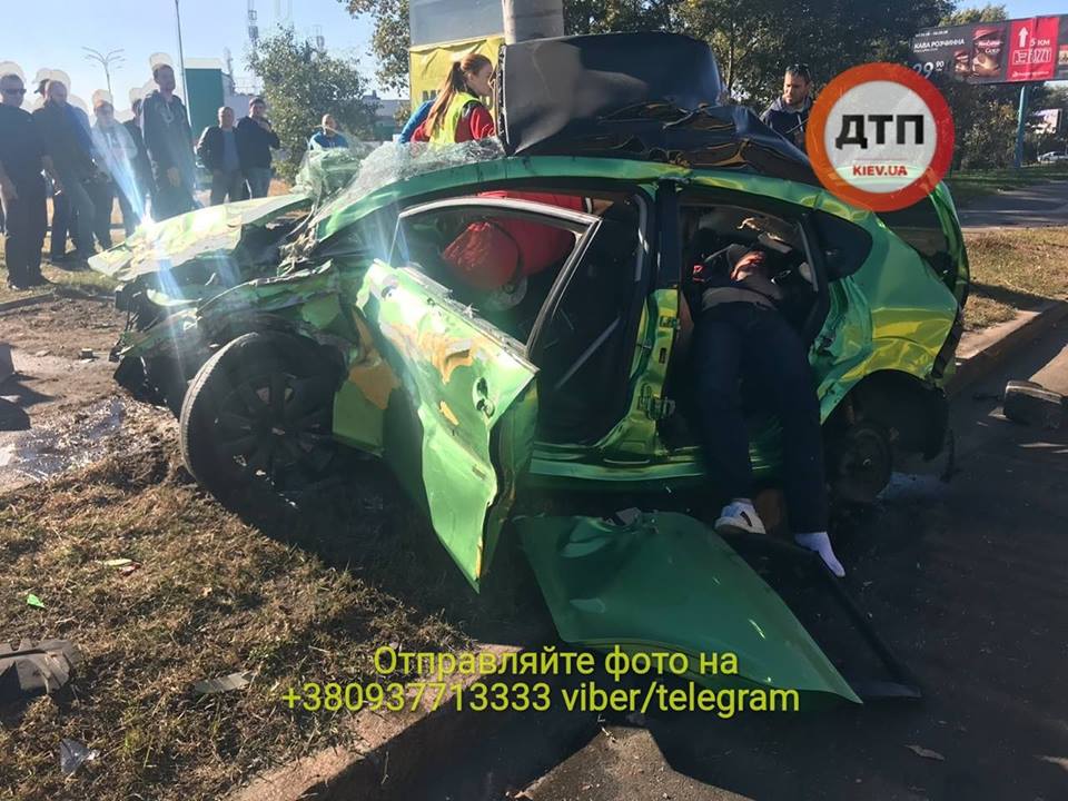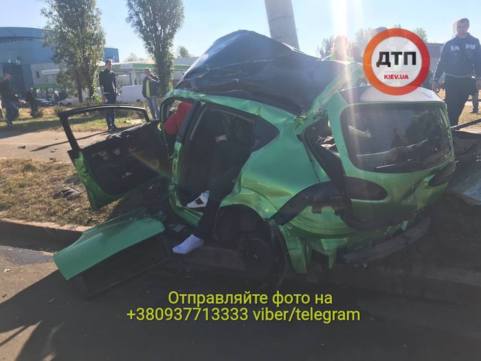 13 октября в Киеве на проспекте Шухевича столкнулись две легковушки, в результате чего два человека погибли, еще четверо - травмированы. Оба авто ехали в попутном направлении: водитель "Киа" перестраивался со второй полосы для поворота на АЗС, а "Сеат" на скорости около 100 км/ч двигался в полосе движения общественного транспорта.