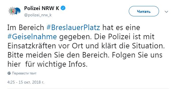 В центре Кельна (ФРГ) сегодня, 15 октября, произошел захват заложников на железнодорожном вокзале, пишет местная полиция в Twitter. Полиция обезвредила преступника.