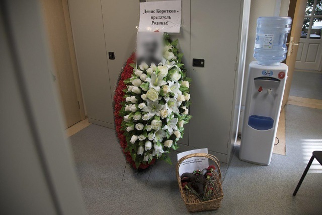 На венке была надпись "Денис Коротков - предатель Родины"; корзина с головой барана содержала записку "Главному редактору "Новой газеты" с приветом Вам и Короткову" (орфография и пунктуация автора сохранены).