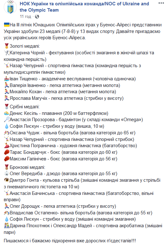 В Буэнос-Айресе завершились III летние Юношеские Олимпийские игры. Спортсмены сборной Украины завоевали на играх в общей сложности 23 медали в 13 видах спорта - 7 золотых, 8 серебряных и столько же бронзовых.