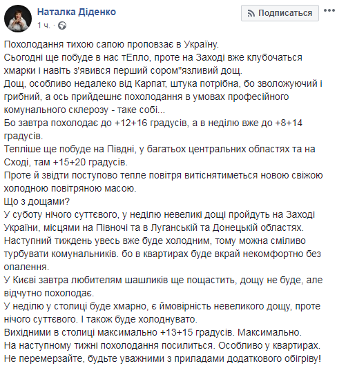 В субботу, 20 октября, похолодает до + 12... + 16 градусов, а в воскресенье уже до + 8... + 14 градусов. Об этом сообщает синоптик Наталья Диденко на своей странице в Facebook.