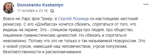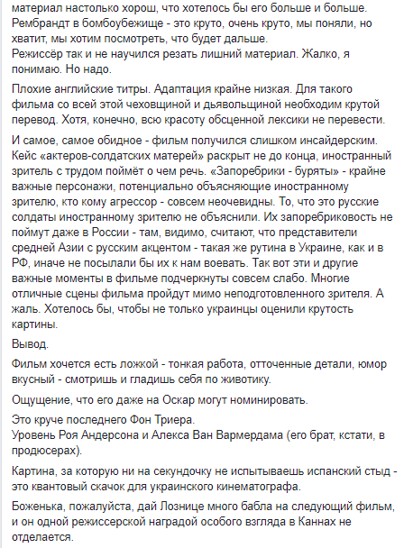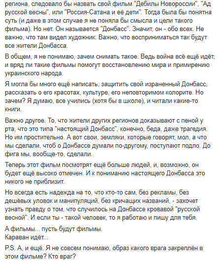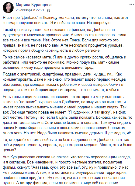 "Я вот про "Донбасс" и Лозницу молчала, потому что не знала, как этот кошмар получше описать. Я и сейчас не знаю. Но попробую. Такой грязи и тупости, как показано в фильме, на Донбассе не существует в массовых проявлениях. А именно так и показано - типа всё такое и все такие. Нет. Этого нет. Точка. Если для кого-то это правда, значит, не повезло вам. А те несколько процентов уродцев, которые портят общую картину, есть в любом регионе.
