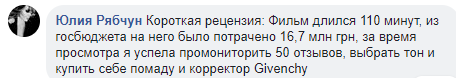"Короткая рецензия: Фильм длился 110 минут, из госбюджета на него было потрачено 16,7 млн грн, за время просмотра я успела промониторить 50 отзывов, выбрать тон и купить себе помаду и корректор Givenchy".