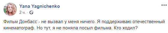 "Фильм Донбасс - не вызвал у меня ничего. Я поддерживаю отечественный кинематограф. Но тут, я не поняла посыл фильма. Кто ходил?"