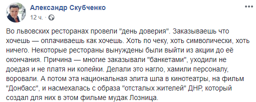 "Во львовских ресторанах провели "день доверия". Заказываешь что хочешь – оплачиваешь как хочешь. Хоть по чеку, хоть символически, хоть ничего. Некоторые рестораны вынуждены были выйти из акции до ее окончания. Причина – многие заказывали "банкетами", уходили НЕ доедая и не платят ни копейки. Делали это нагло, хамили персоналу, воровали. А потом эта национальная элита шла в кинотеатры, на фильм "Донбасс", и насмехалась с образа "отсталых жителей" ДНР, который создал для них в этом фильме мудак Лозница".