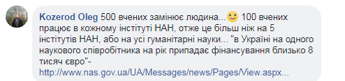 В комментариях сообщили, что на деятельность одного "института Вятровича" предложено выделить сумму, превышающую финансирование пяти институтов Национальной академии наук Украины или 500 ученых.