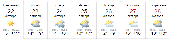 Сайт Gismeteо обещает солнечный понедельник с температурой до +11 днем. Во вторник температура снизится до +9 днем, возможен небольшой дождь. В среду и четверг днем до +6...+8, дождь. а вот выходные будут теплыми и сухими: до +16...+19.