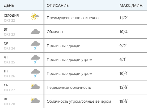 Сайт Weather.com обещает проливные дожди в среду, четверг и пятницу и снижение температуры до +6...+9. В субботу и воскресенье переменная облачность, до +15... +19.