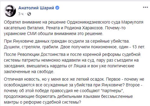 "При Януковиче данных граждан осудили за серийные убийства. Душили, стреляли, грабили. Двое получили пожизненное, один - 13 лет. После Революции Достоинства и после коренной реформы судебной системы патриоты немножко надавили на суд, пару раз съездили на заседания, вмешались нардепы от Ляшка и вон уже политические заключенные на свободе", - написал Шарий.