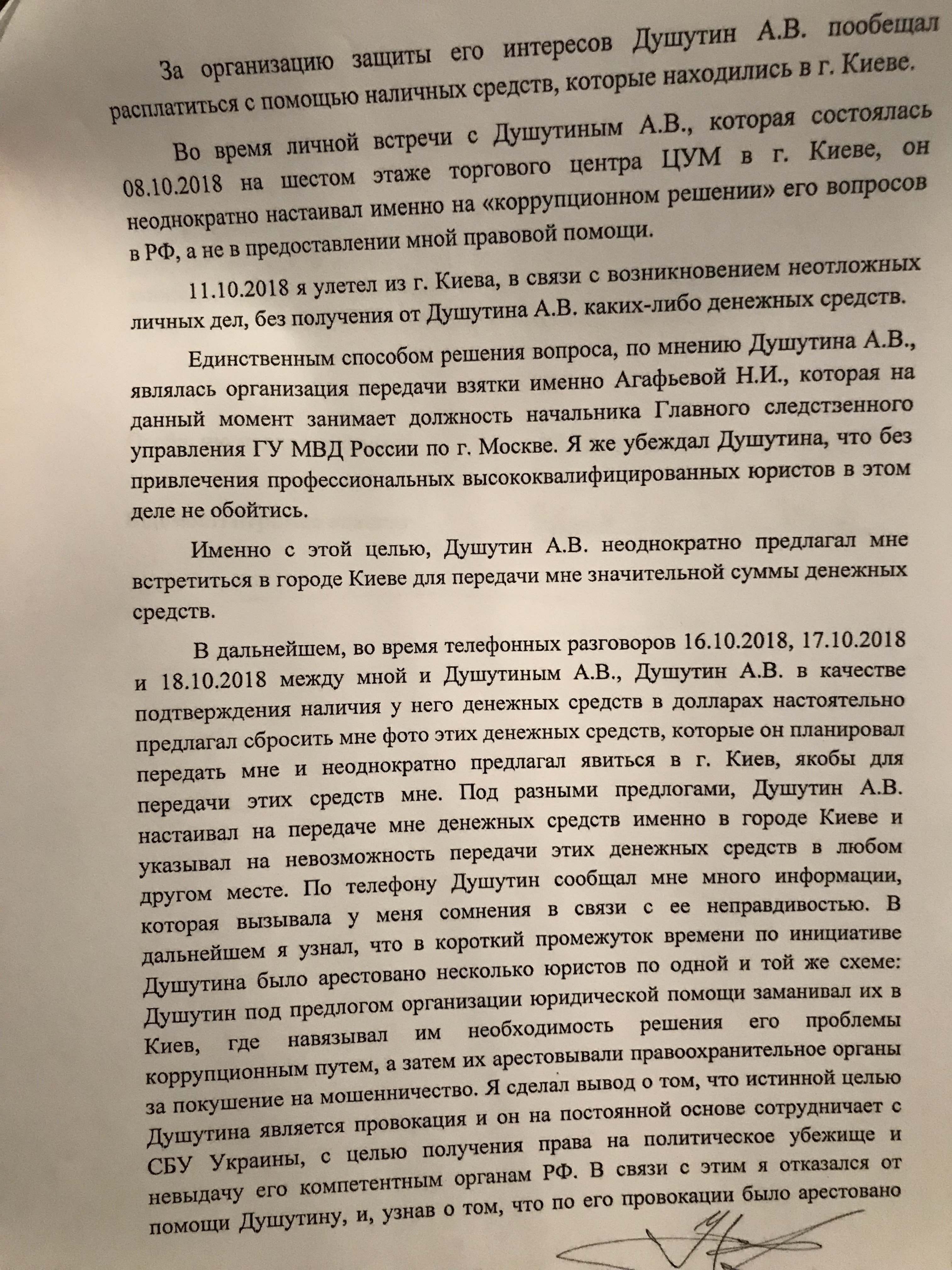 В его интерпретации, Душутин под предлогом организации юридической помощи заманивал адвокатов в Киев, где навязывал им необходимость решения его проблемы с помощью взяток. Когда те соглашались таким образом "помогать" Алексею Викторовичу, юристов задерживали и брали под арестом силовики Украины.