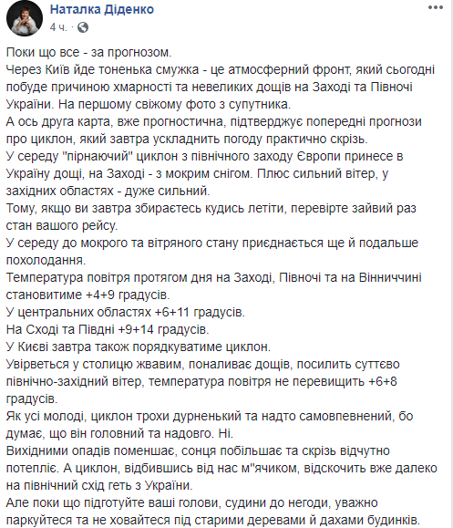 В среду к мокрой и ветряной погоде присоединится еще и дальнейшее похолодание. Температура воздуха в течение дня на Западе, Севере и в Винницкой области составит +4...+9 градусов. В центральных областях +6...+11 градусов. На Востоке и Юге +9...+14 градусов. В Киеве завтра также распорядится циклон.