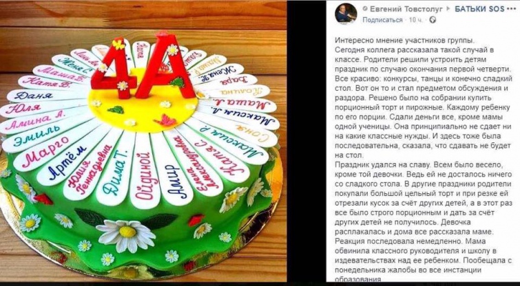 "Все красиво: конкурсы, танцы, и, конечно же, сладкий стол. Вот он и стал предметом обсуждения и раздора. На собрании решили купить порционный торт и пирожные. Деньги сдали все, кроме мамы одной ученицы. Она принципиально не сдает деньги ни на какие нужды класса", - написал мужчина.