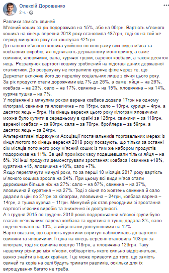 Альтернативные подсчеты Ассоциации поставщиков торговых сетей с конца февраля по конец сентября 2018 показывают, что только за последние семь месяцев текущего года мясная корзина с тем же набором продуктов подорожала на 11%. За этот промежуток времени подешевели только яйца - на 6%. Все остальные продукты демонстрировали рост: колбаса и свинина + 18%, курятина 15, говядина +10%, сало +7%.