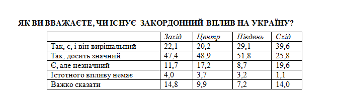 Влияние на Украину Евросоюза большинство опрошенных (55%) определили как положительное; негативным такое влияние считают 29%. В целом положительная оценка влияния на нашу страну со стороны США также преобладает над отрицательной (44% против 36%). Влияние России подавляющее большинство опрошенных (75%) охарактеризовало как негативное, и лишь 8% считают его полезным для Украины.