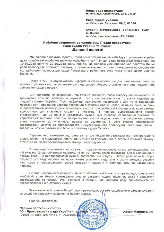 Инициатором обращения стал столичный адвокат Арсен Маринушкин, открывший сбор подписей в адрес Высшего совета правосудия, Совета судей Украины и судей Печерского района Киева.