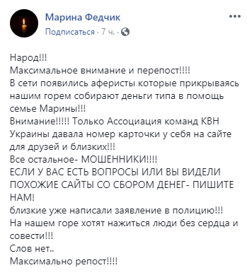 "В сети появились аферисты, которые прикрываясь нашим горем собирают деньги типа в помощь семье Марины! Внимание! Только Ассоциация команд КВН Украины давала номер карточки у себя на сайте для друзей и близких. Все остальное – мошенники. Если у вас есть вопросы или вы видели похожие сайты со сбором денег – пишите нам", – написала она.